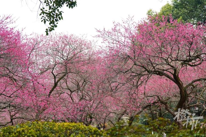 杭州植物园灵峰探梅景区也是传统赏梅胜地,这里足足收藏了11大梅花品种群、100多个品种、5000多株梅树,目前开花率已超50%,正是最佳观赏期,主打品种“细枝朱砂”除了花色艳丽,还可以欣赏其树干及枝条虬曲苍劲、别具一格的独特韵味。