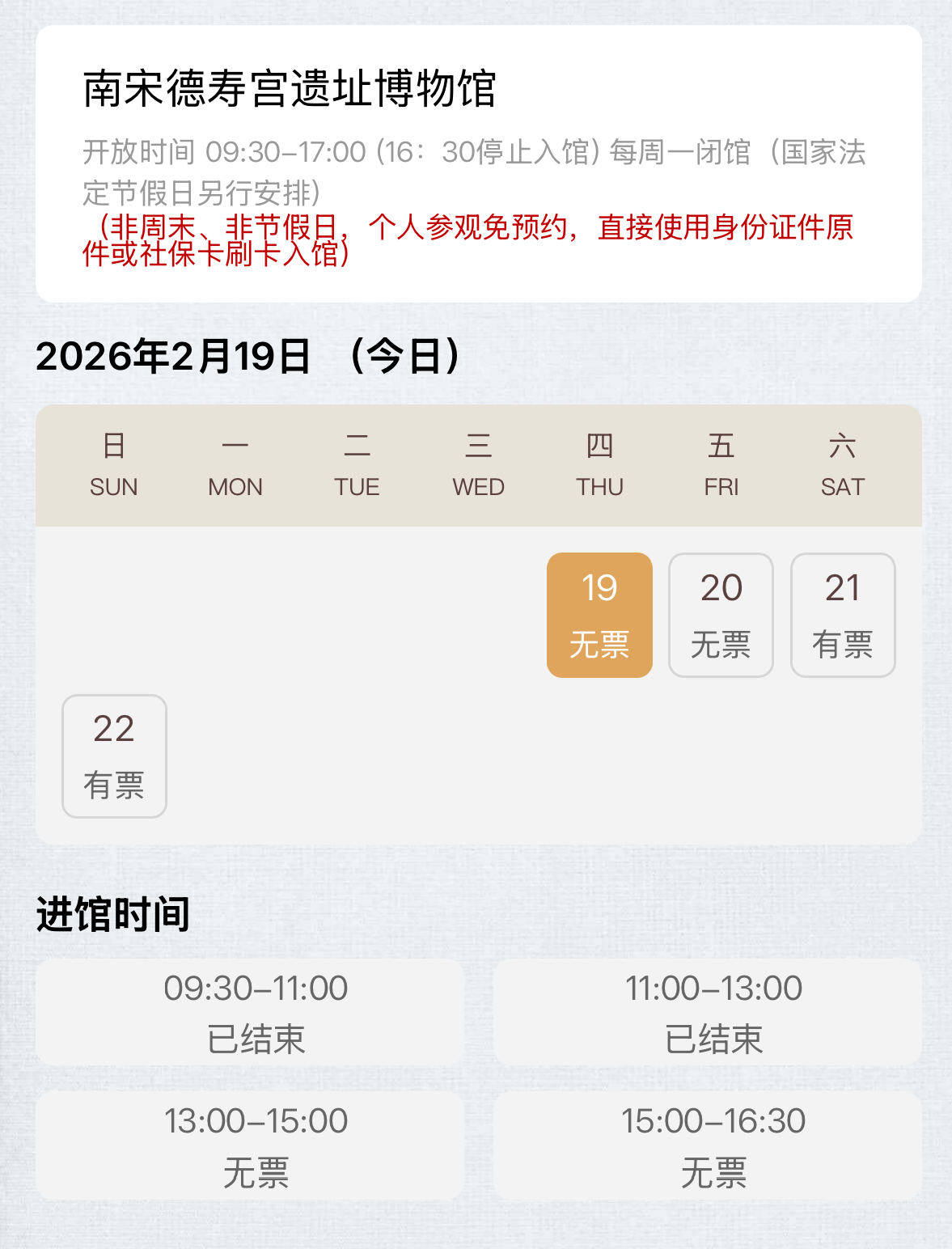 2月19日至20日,南宋德寿宫遗址博物馆预约已满,21日至22日仍有票。