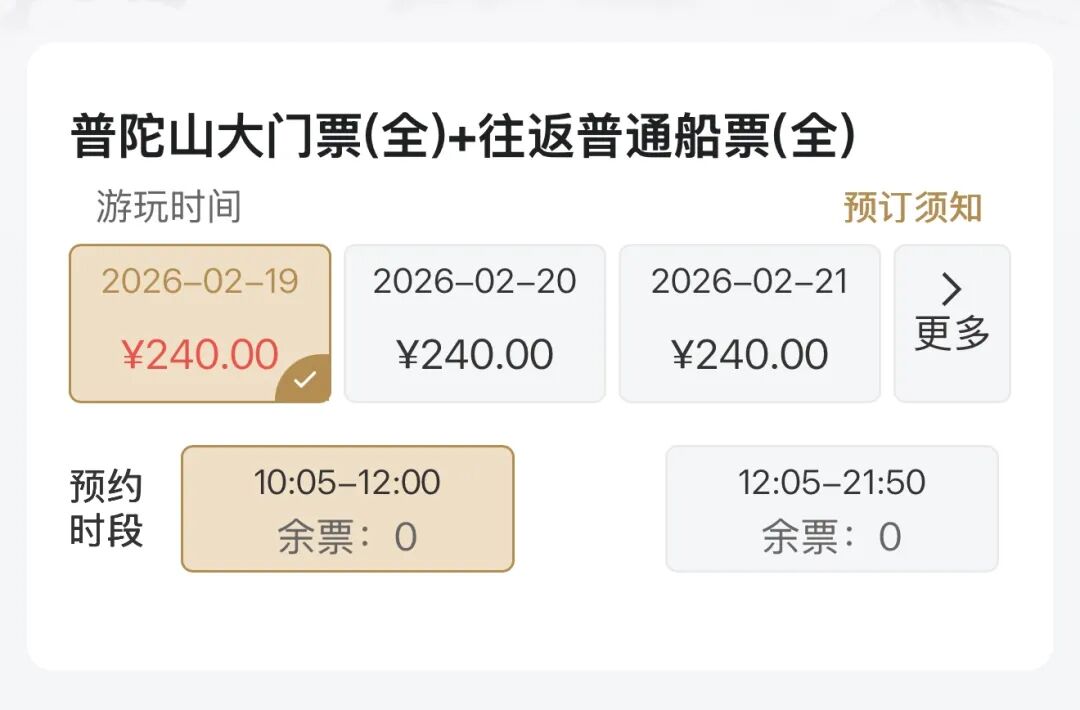 舟山普陀山景区发布了重要的公告称,2月19日普陀山景区门票线上预订数量目前已满,现暂停线上购票。购票小程序显示,今天下午时段的普陀山各类门票都已售罄。