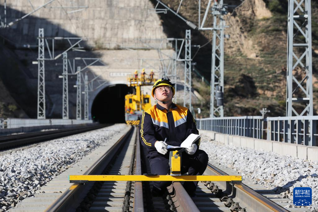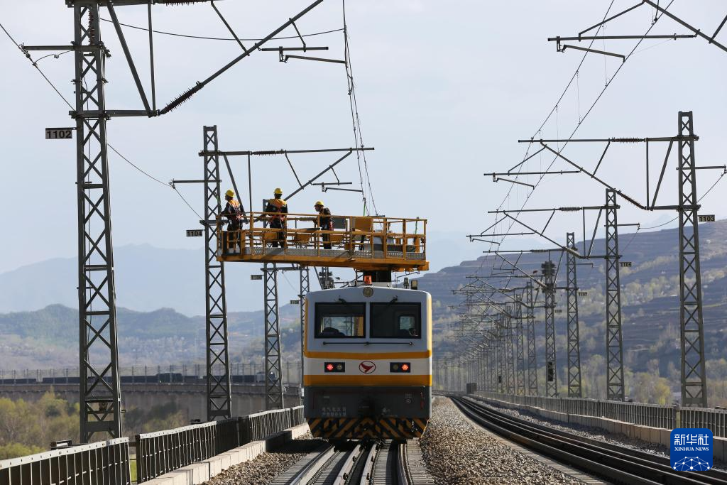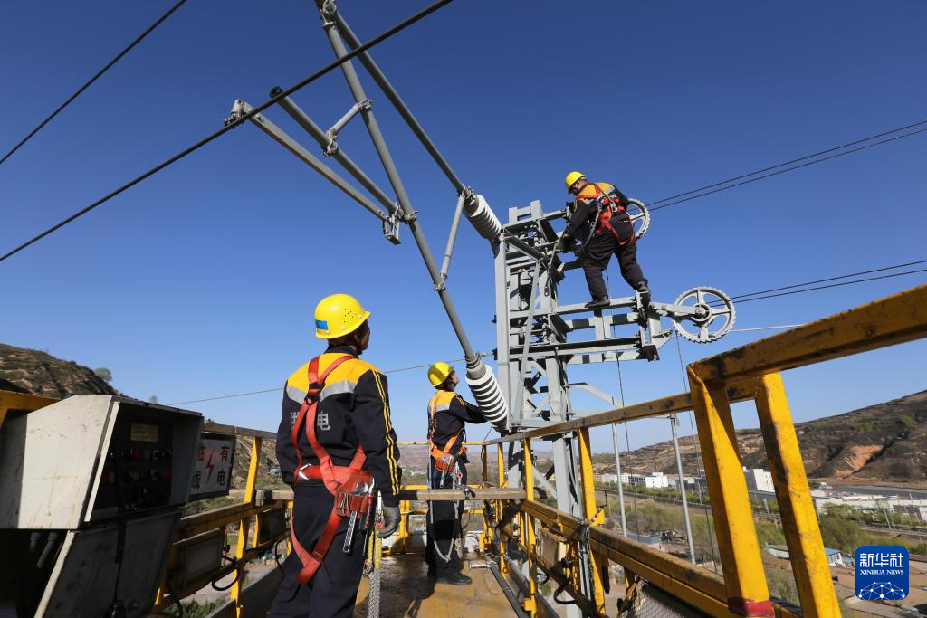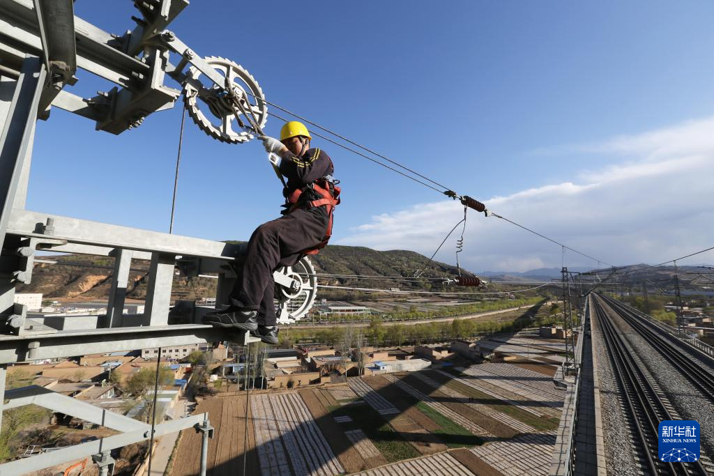 4月17日,兰州供电段员工在兰渝铁路甘肃省定西市渭源县境内进行接触网会集修作业。新华社发(王克贤摄)